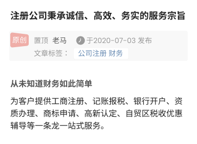 專注于從事財稅咨詢、財稅外包、代理記賬等財稅服務,同時提供企業管理咨詢等項目服務。